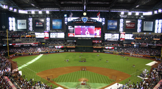 Chase Field - Arizona DiamondbacksFrom its signature swimming pool to its retractable roof, Chase Field has become one of the game's most recognizable landmarks. Since the air-conditioned facility first opened its doors to a regular-season game on March 31, 1998, nearly 17.5 million baseball fans have enjoyed the opportunity to watch the Arizona Diamondbacks without worrying about Phoenix's summer heat or monsoon storms CLICK TO VISIT |